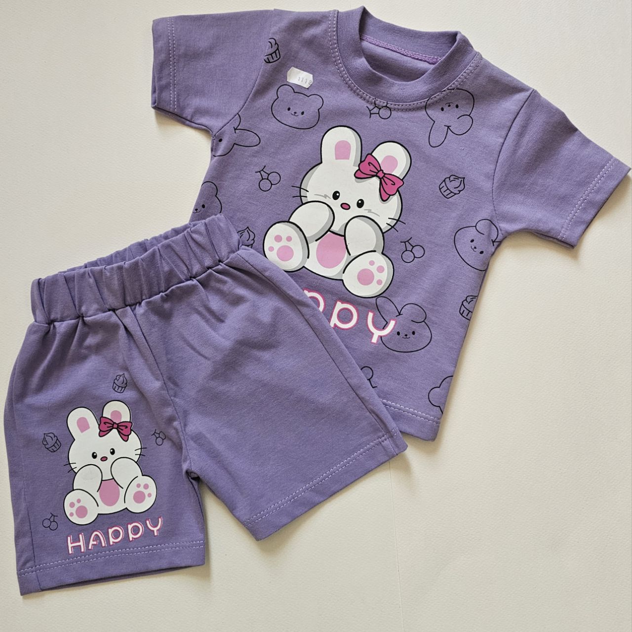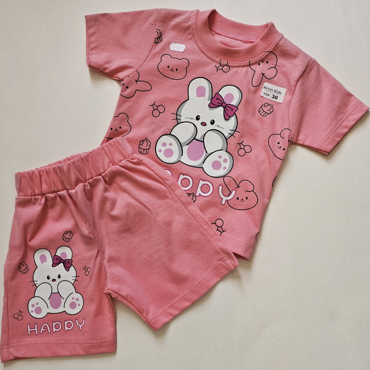 ست تیشرت و شلوارک نوزادی دخترانه خانگی تابستانه با طرح چاپی خرگوش در ۳ رنگ صورتی بنفش گلبهی موجود در سایز ۳۰ جنس نخ درجه یک و با کیفیت