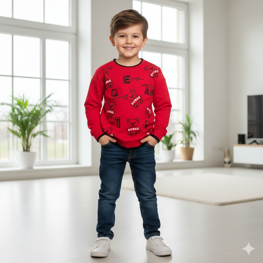 رنگبندی: رنگ اصلی لباس قرمز تند و جذاب است که با چاپهای مشکی و سفید ترکیب شده و جلوهای شاد به استایل کودک میدهد.