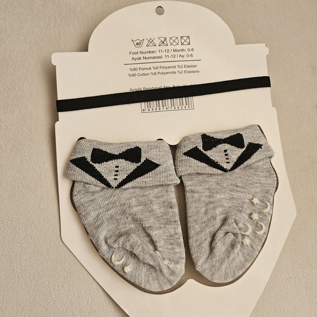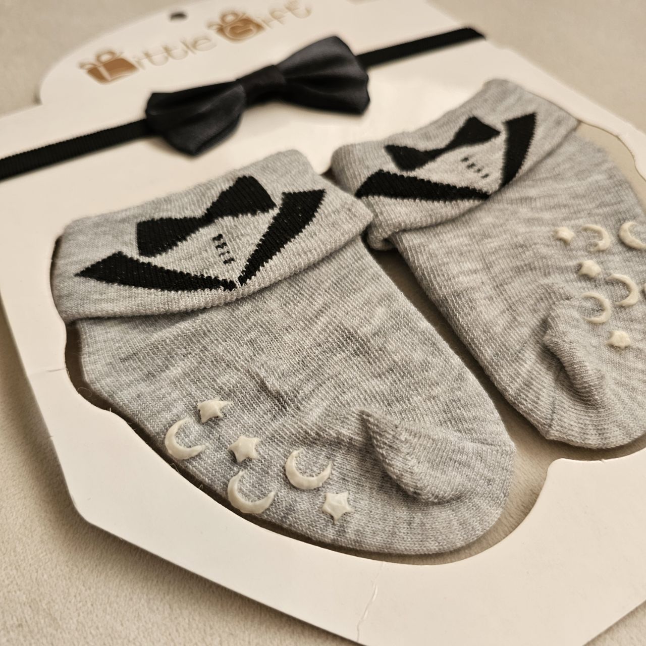 ویژگی ایمنی: کف جورابها دارای استوپر (ترمزگیر) با طرح ماه و ستاره است که از لیز خوردن نوزاد جلوگیری میکند.