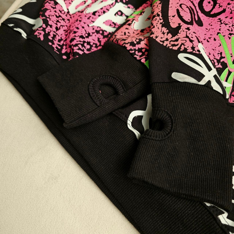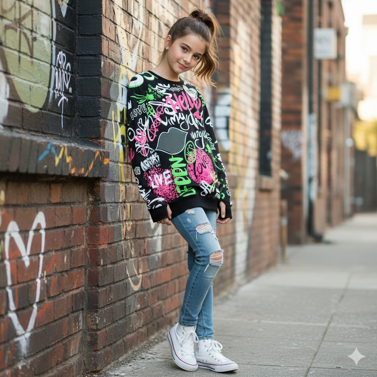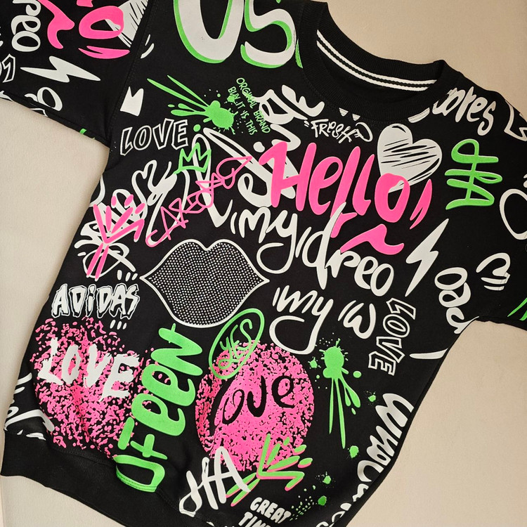 طراحی: چاپ گرافیتی تمامصفحه با المانهای فانتزی مثل لب، قلب و نوشتههای رنگی (سبز نئونی و صورتی).