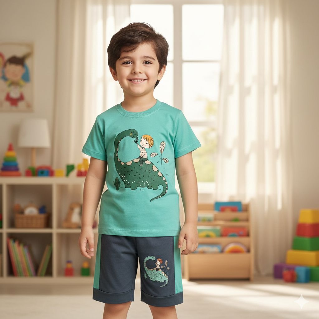 ست تیشرت شلوار نخ پنبه پسرانه با طرح چاپی دایناسور