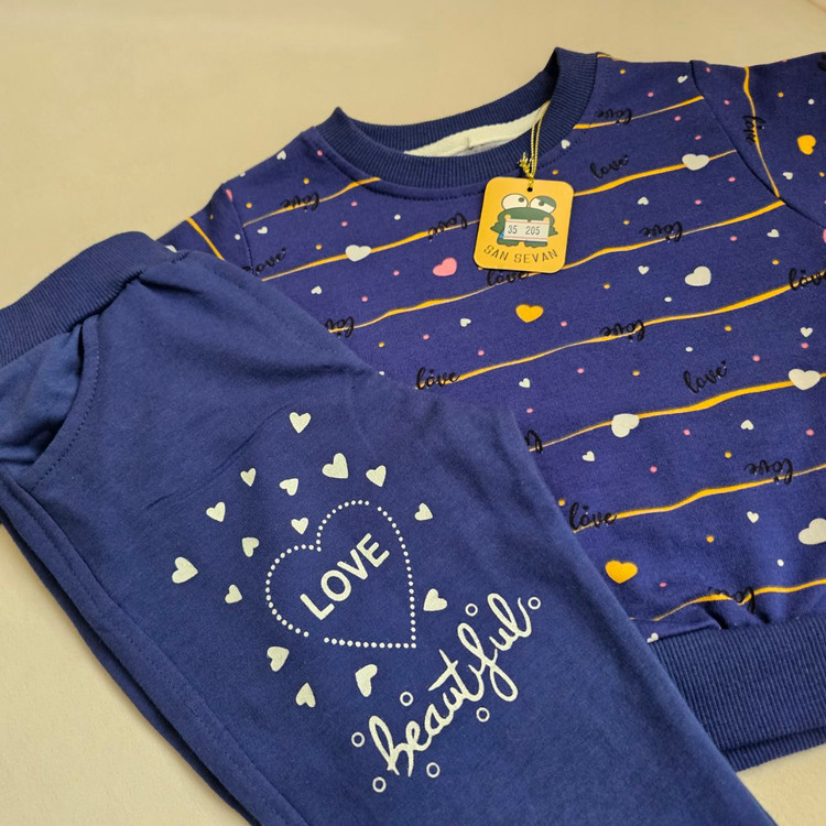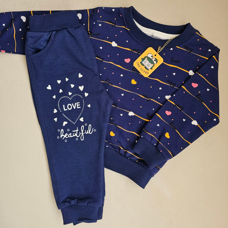 طراحی شلوار: شلوار ست سرمهای با چاپ باکیفیت طرح قلب و نوشته "LOVE" روی ران که با طرح بلوز کاملاً هماهنگ است.