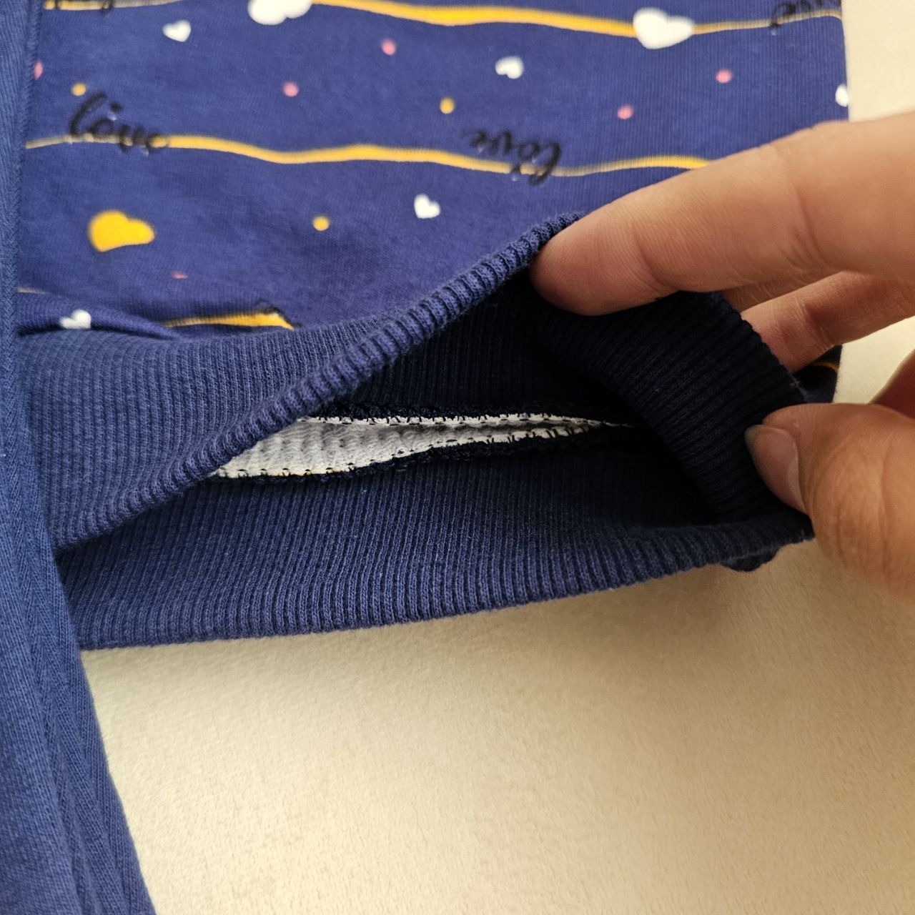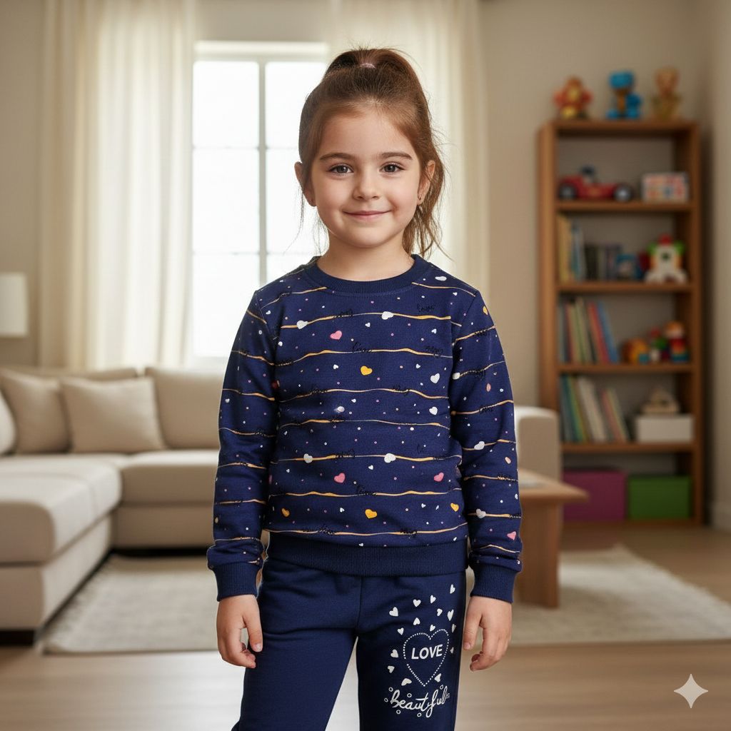 طراحی شلوار: شلوار ست سرمهای با چاپ باکیفیت طرح قلب و نوشته "LOVE" روی ران که با طرح بلوز کاملاً هماهنگ است.