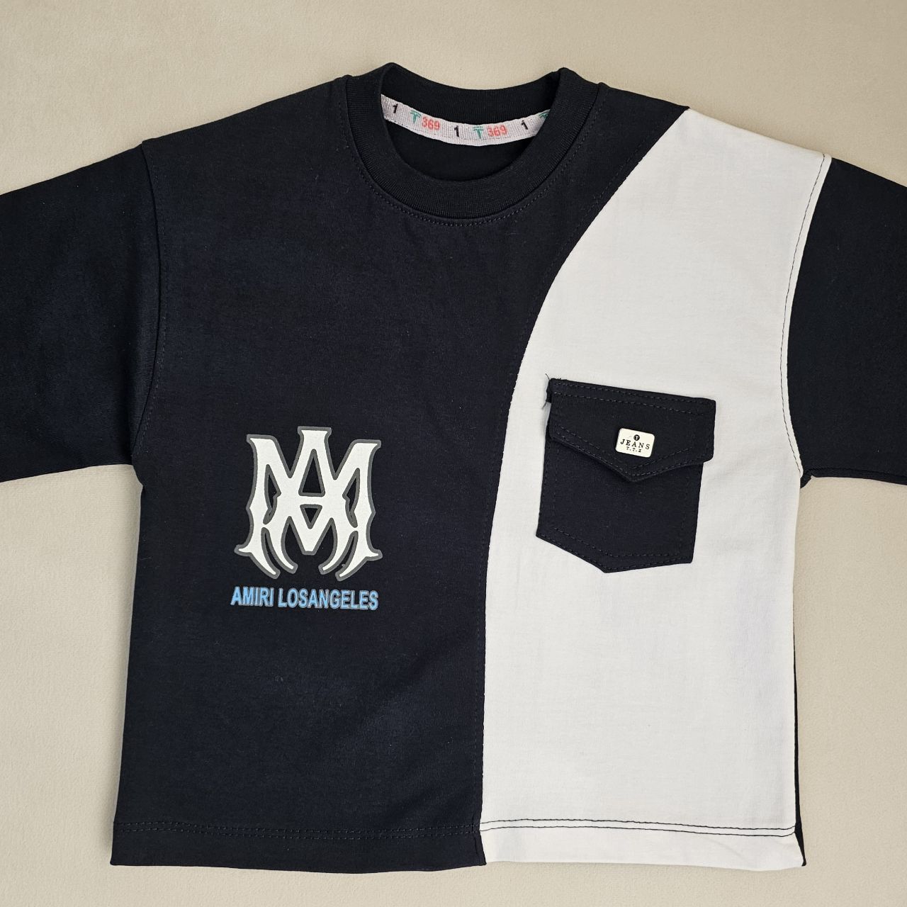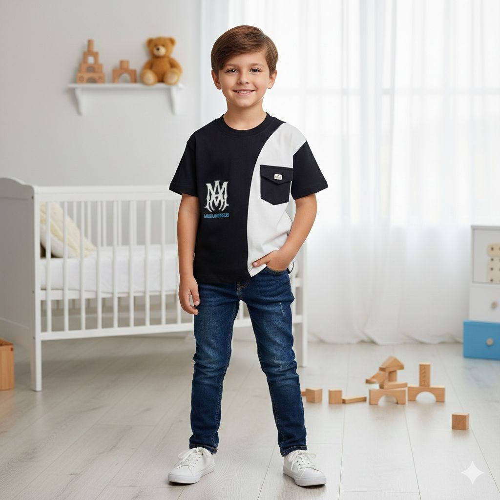 تیشرت (یا دورس نازک) با طراحی Black & White و جیب کاربردی روی سینهطراحی: مدل ترکیبی دو رنگ (نیمه مشکی، نیمه سفید) با جیب پاکتی دکمهدار.