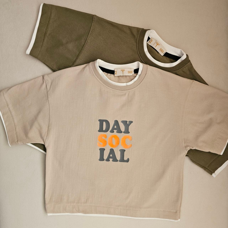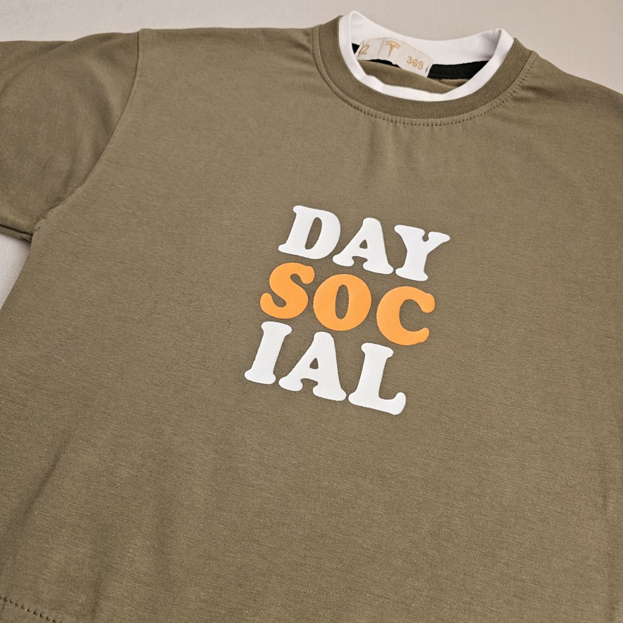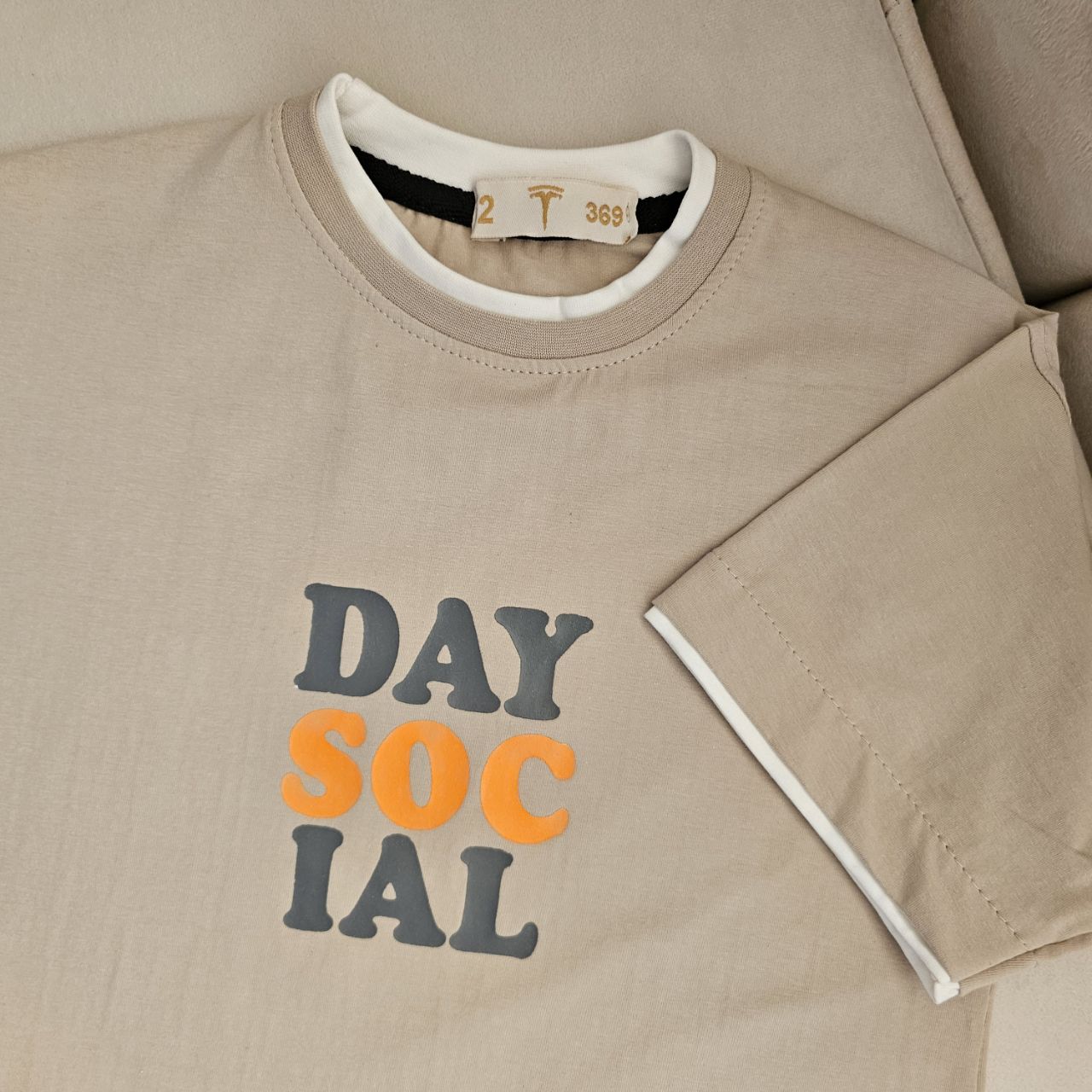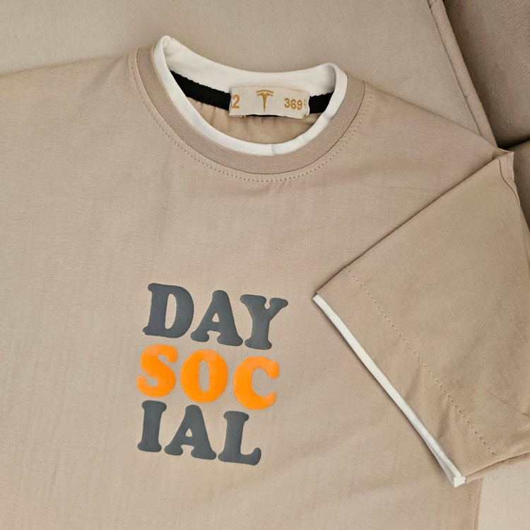 طراحی: دارای چاپ برجسته عبارات "DAY SOCIAL" با ترکیب رنگی جذاب نارنجی و طوسی.