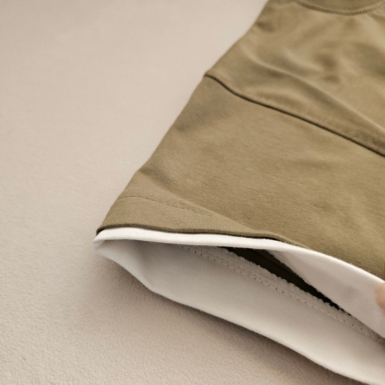 جزئیات: یقه و لبه آستینها دارای دوخت دو لایه (Trim) سفید که جلوهای خاص به لباس داده است.